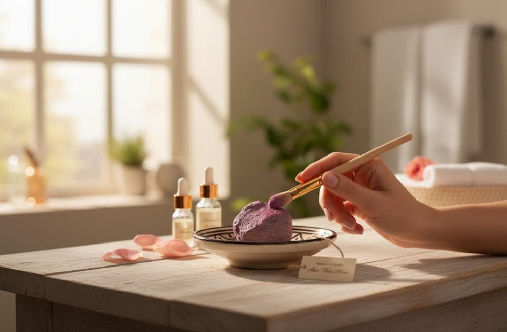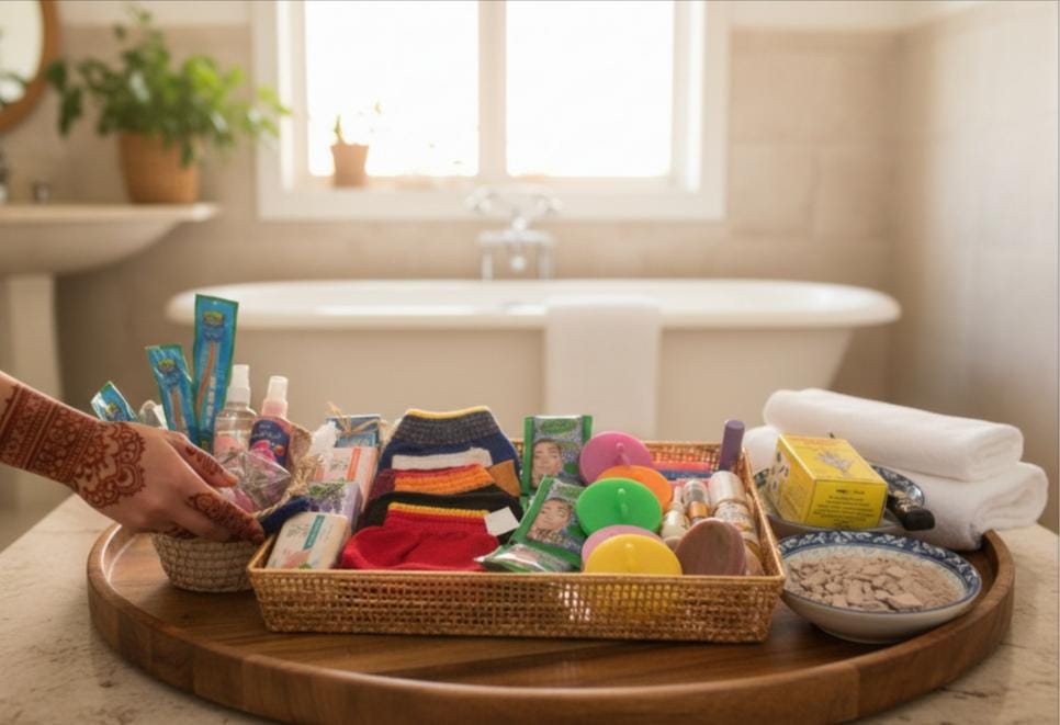 Family bathroom basket contains: akkar fassi which gives a natural lip coloring; natural beldi soap which prepares the skin for exfoliation; clay to clean and sanitize the skin (it is mixed with water to form a paste to form masks); natural kohl it allows to intensify the look, to use it, dip the applicator stick in the powder, then slide it on the mucous membrane of the lower eyelid by pulling the eye outwards; this package also contains several soaps like nila blue, it is a natural tonic and lightener; we do not forget the miswak, it helps maintain the teeth, it fights bacteria and it protects the gums (to use it chew a small part of miswak to fray the fibers and form a small brush, rinse your teeth by rubbing gently then rinse and let the siwak dry in the air) it has a lifespan of two weeks, to be used two to three times a day; This package also includes henna, it strengthens the hair, regulates sebum, it is used by women to adorn their hands, it gives a magnificent color to the hair; we also find rose water, it is rich in antioxidants and vitamin E, it fights against wrinkles and gives a superb complexion, is used to moisturize, tone and soothe the skin; finally there are traditional lipsticks, gloves, brushes for you and your loved ones.