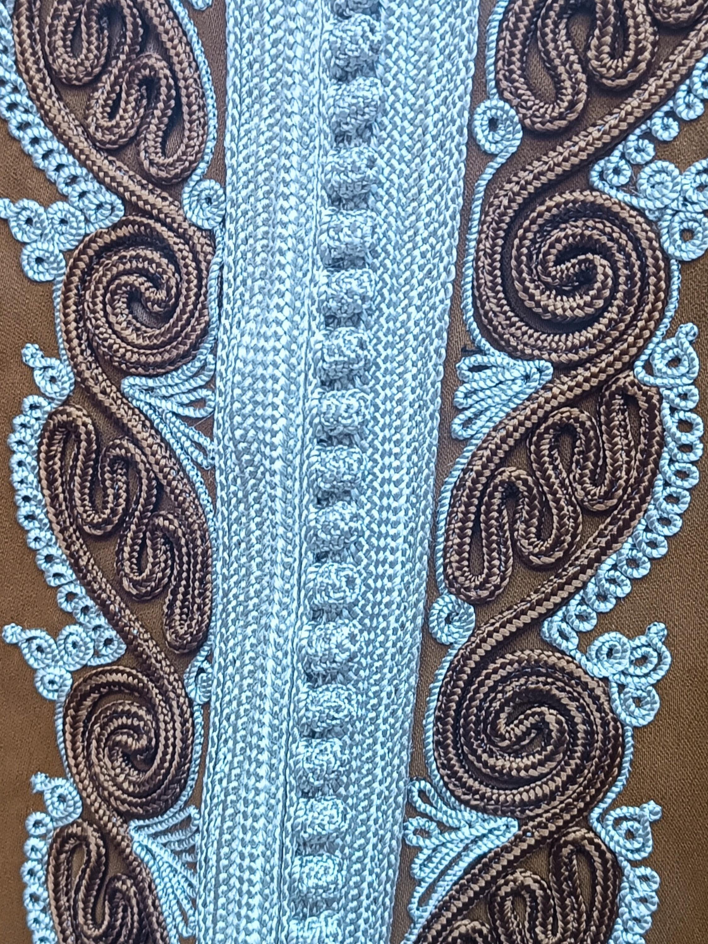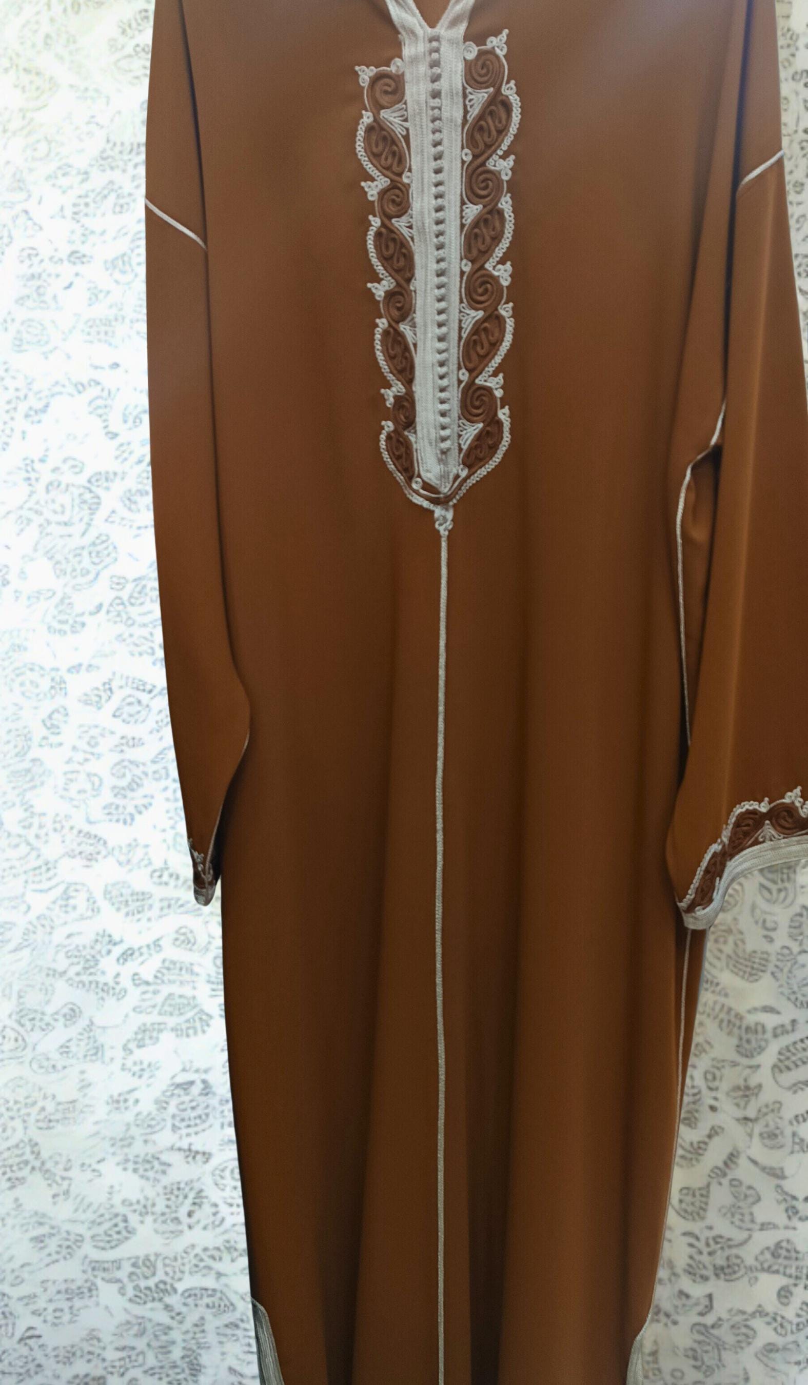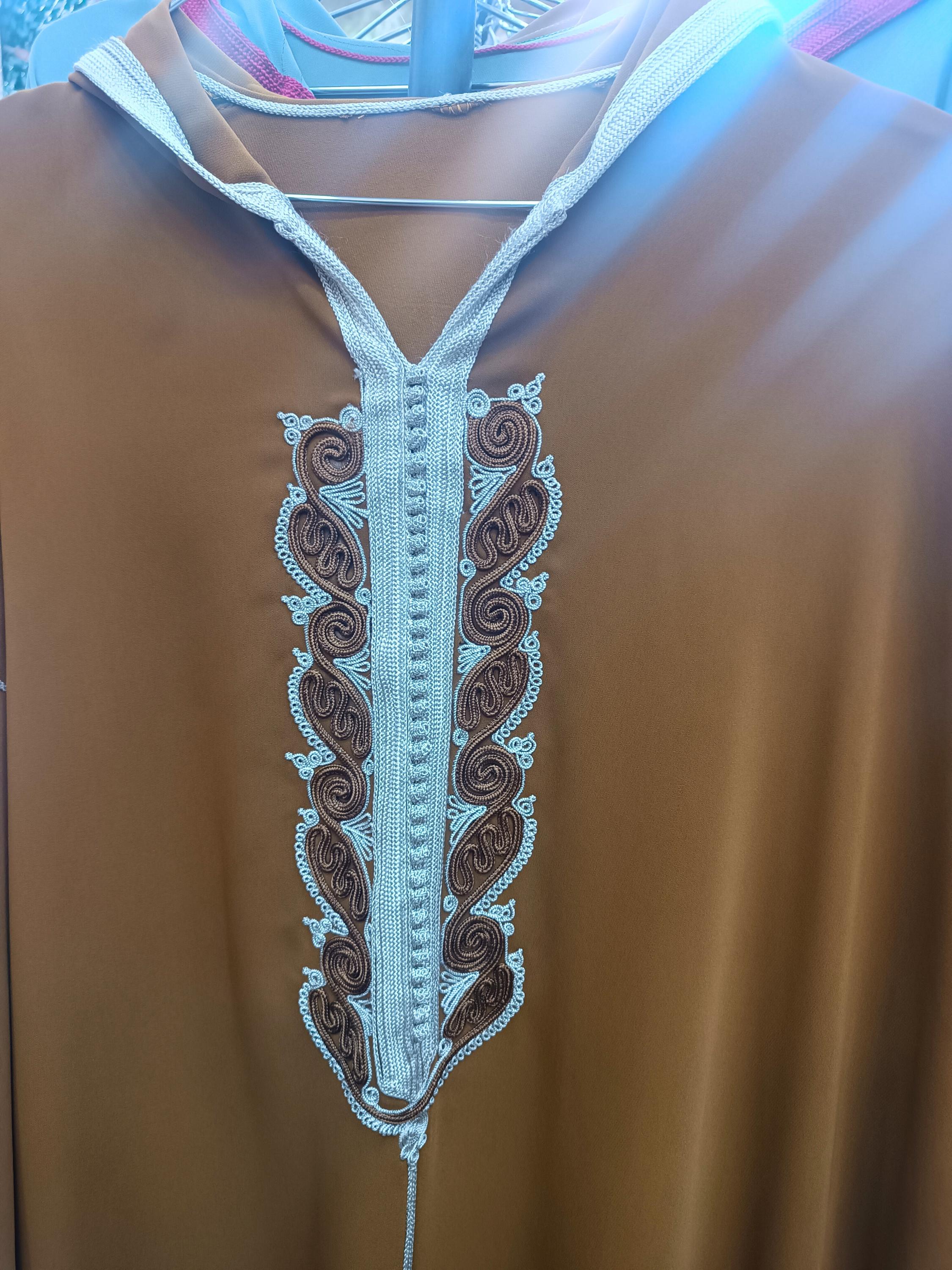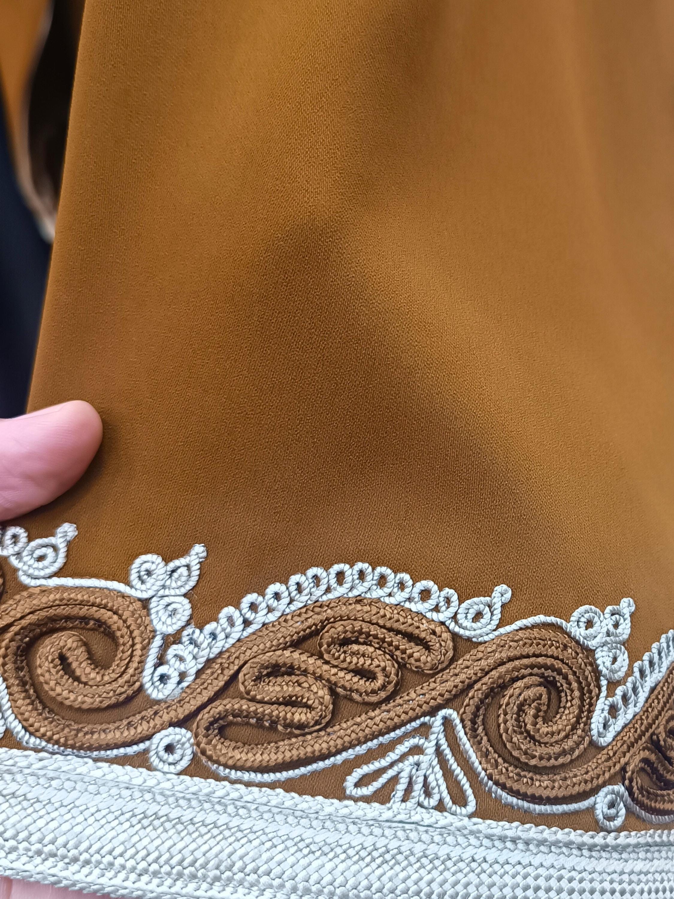 Handmade Moroccan djellaba, elegant caramel with beige Knot and delicate embroidery.