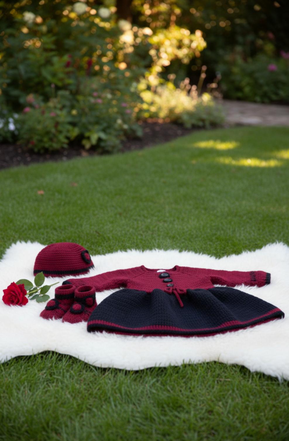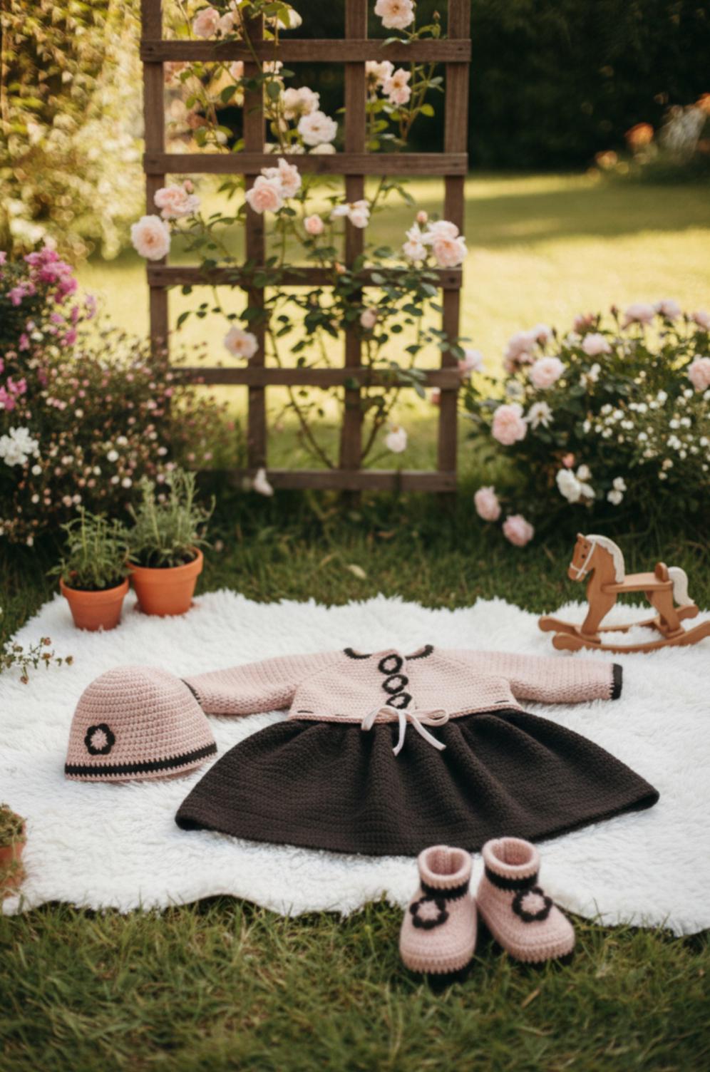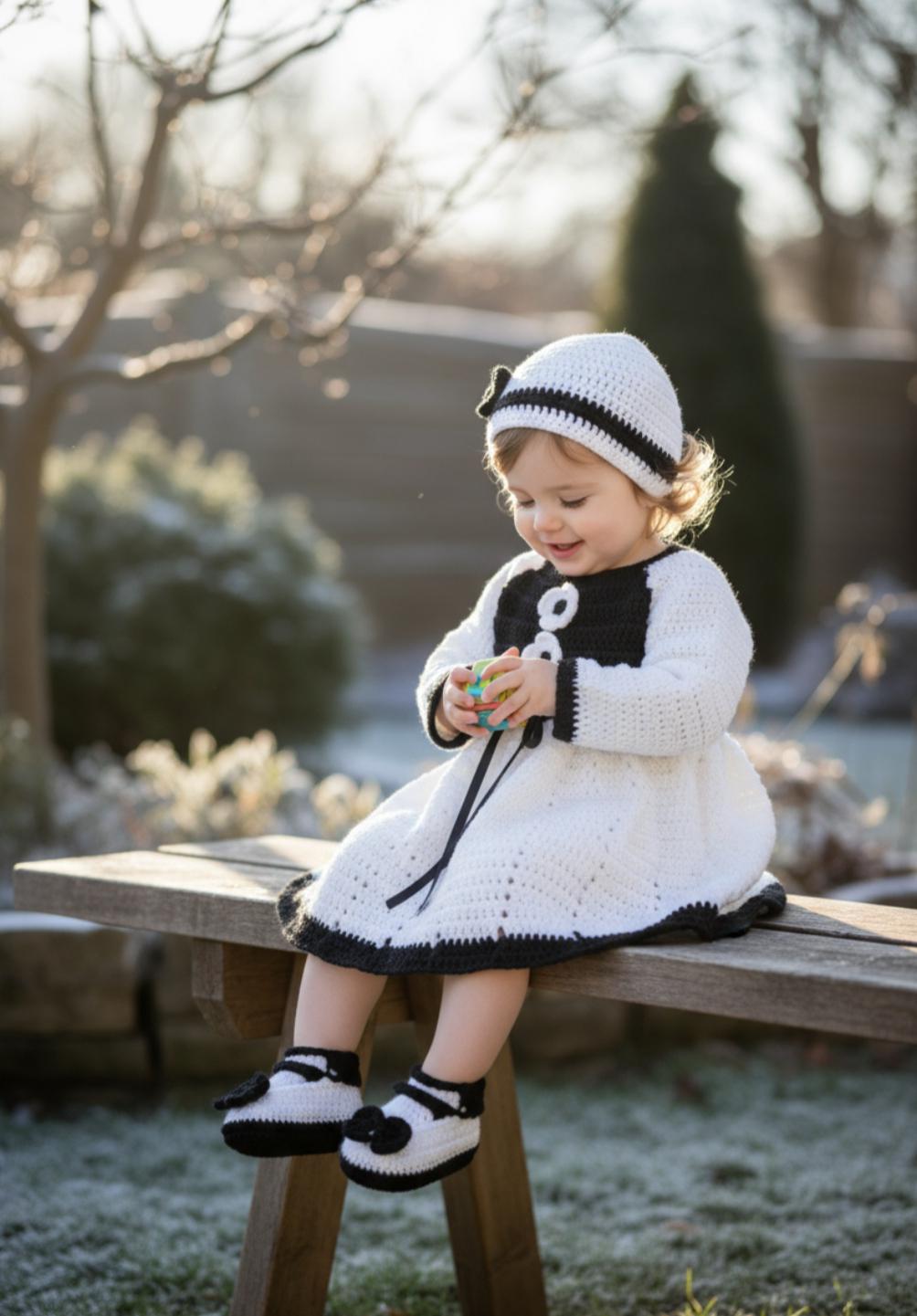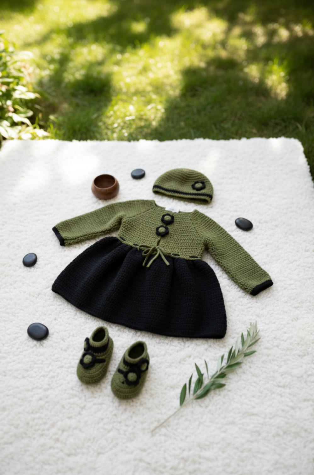 An exceptional crochet set consisting of an elegant dress, a delicate bonnet and refined socks, offering warmth, softness and haute couture allure.