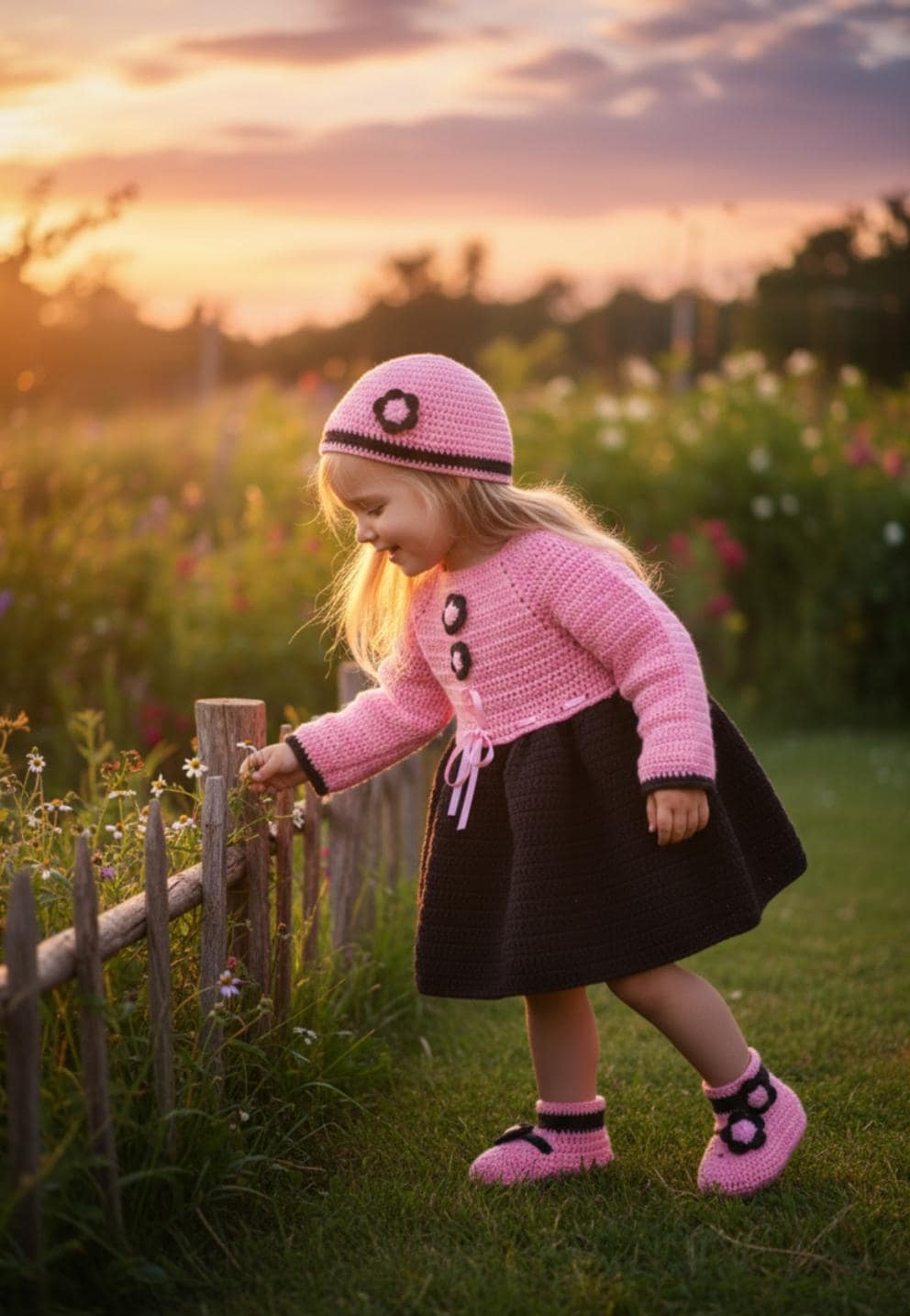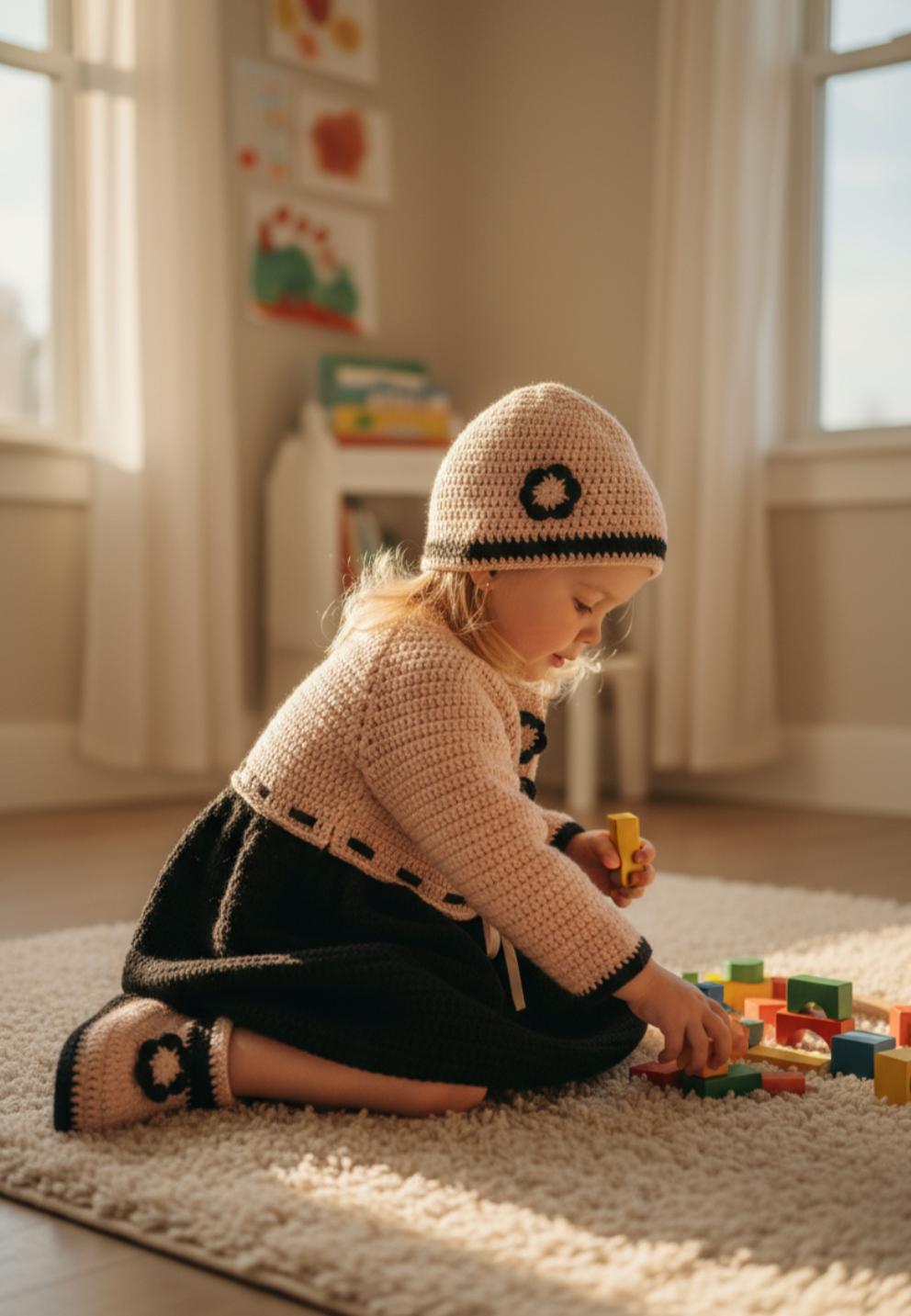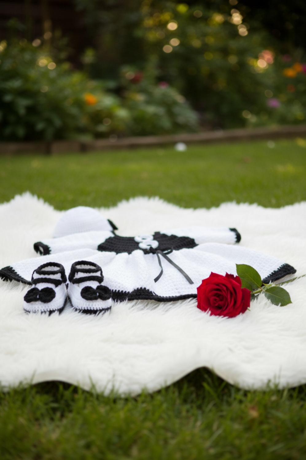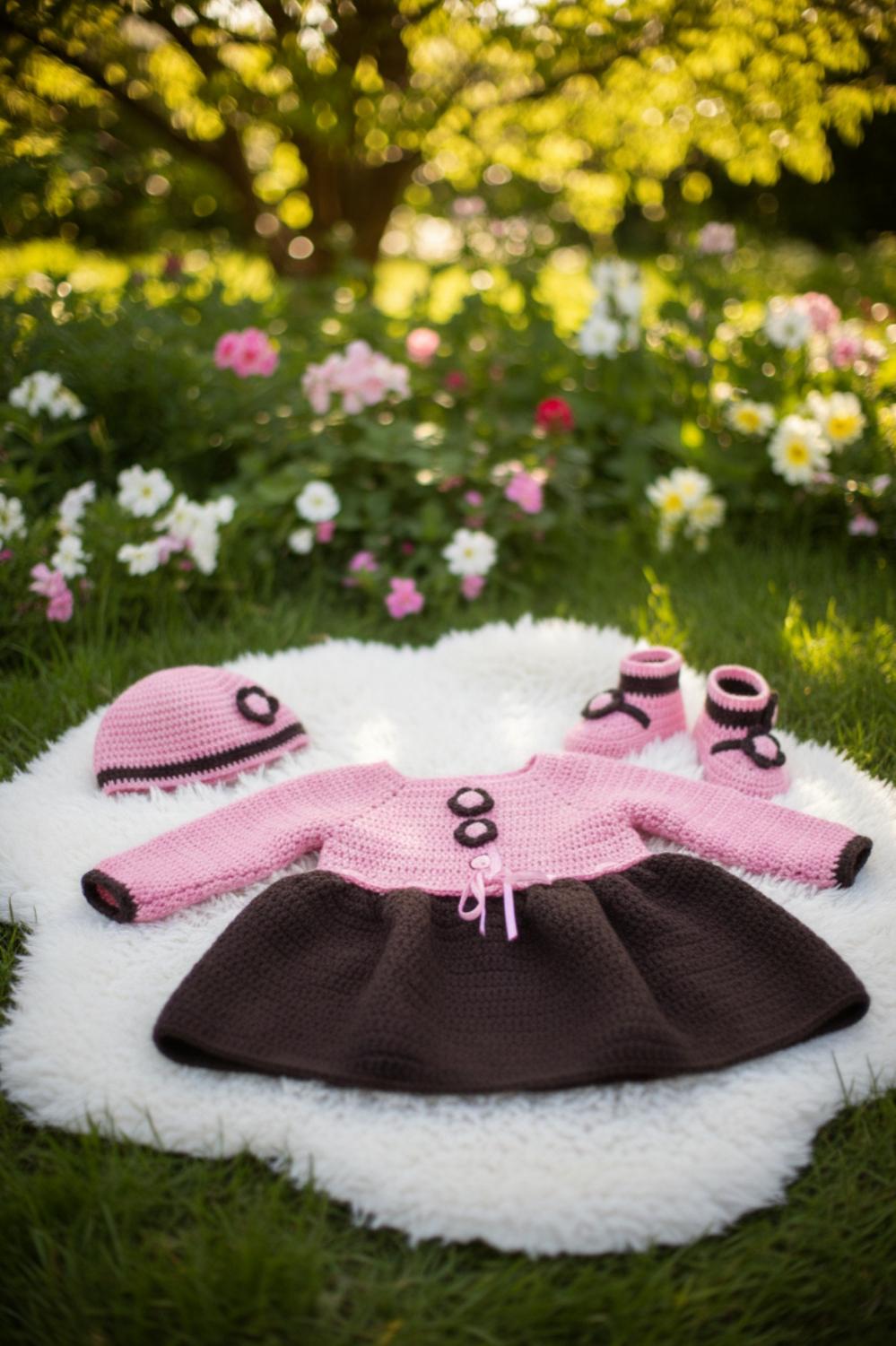An exceptional crochet set consisting of an elegant dress, a delicate bonnet and refined socks, offering warmth, softness and haute couture allure.