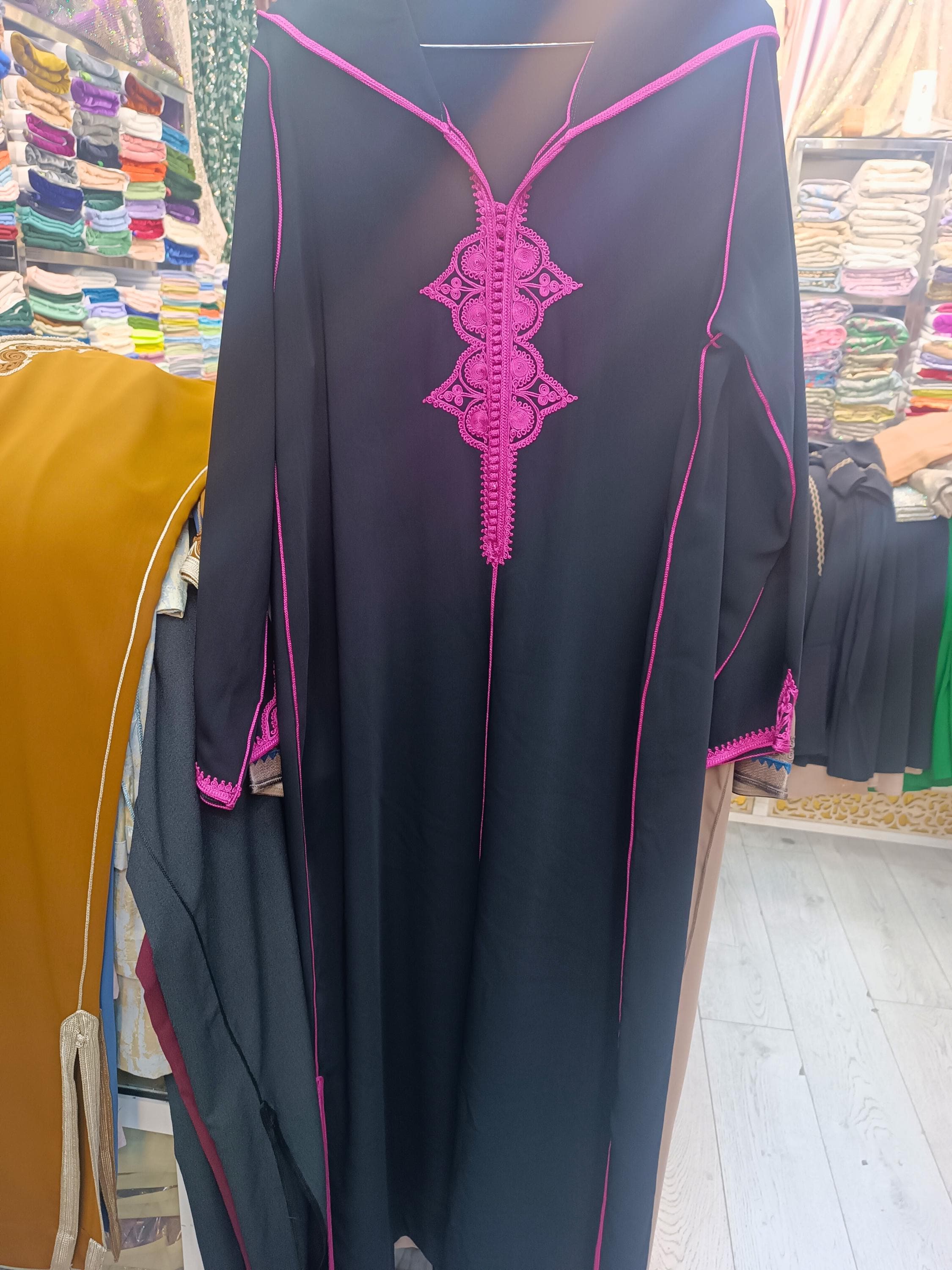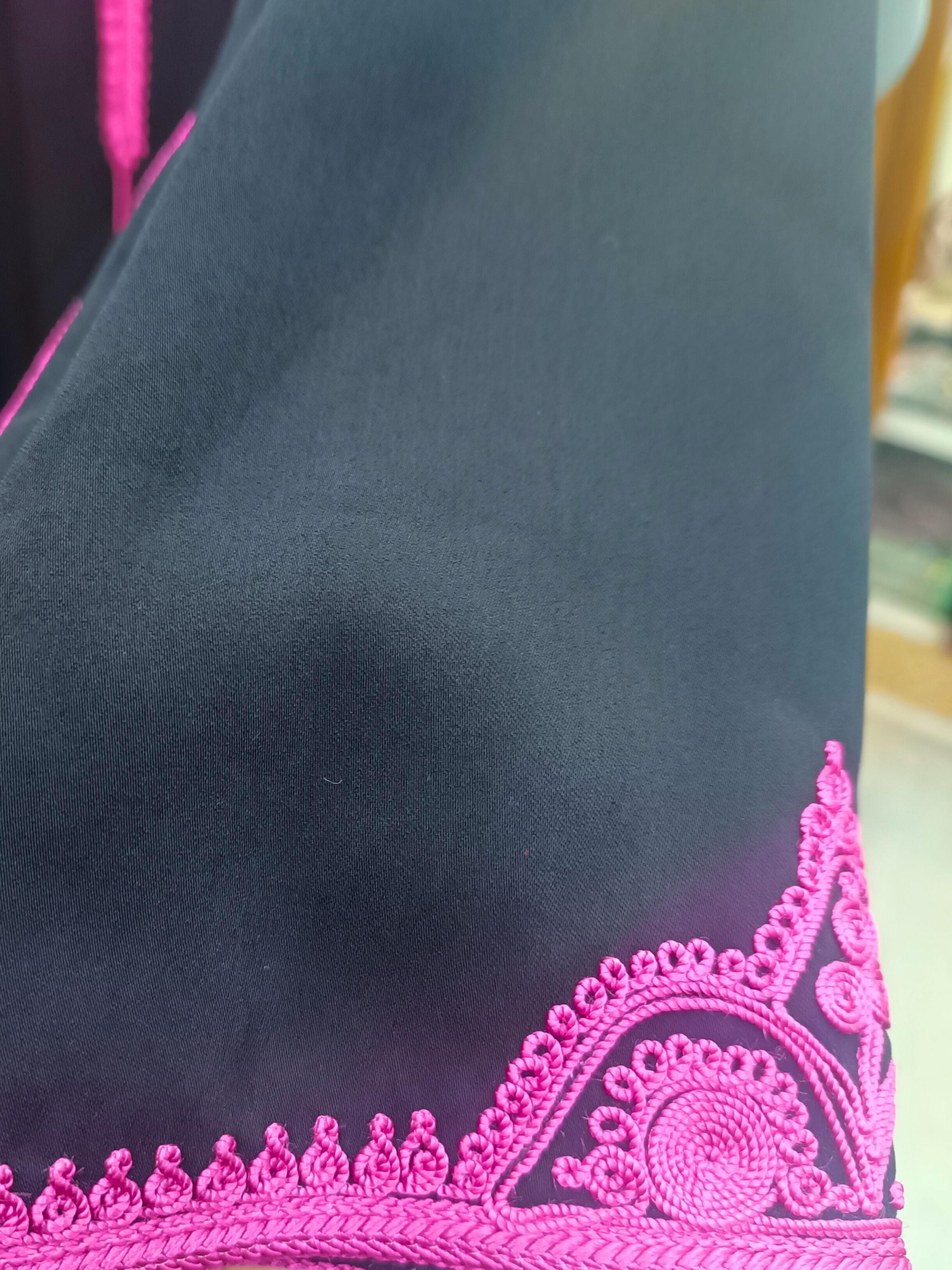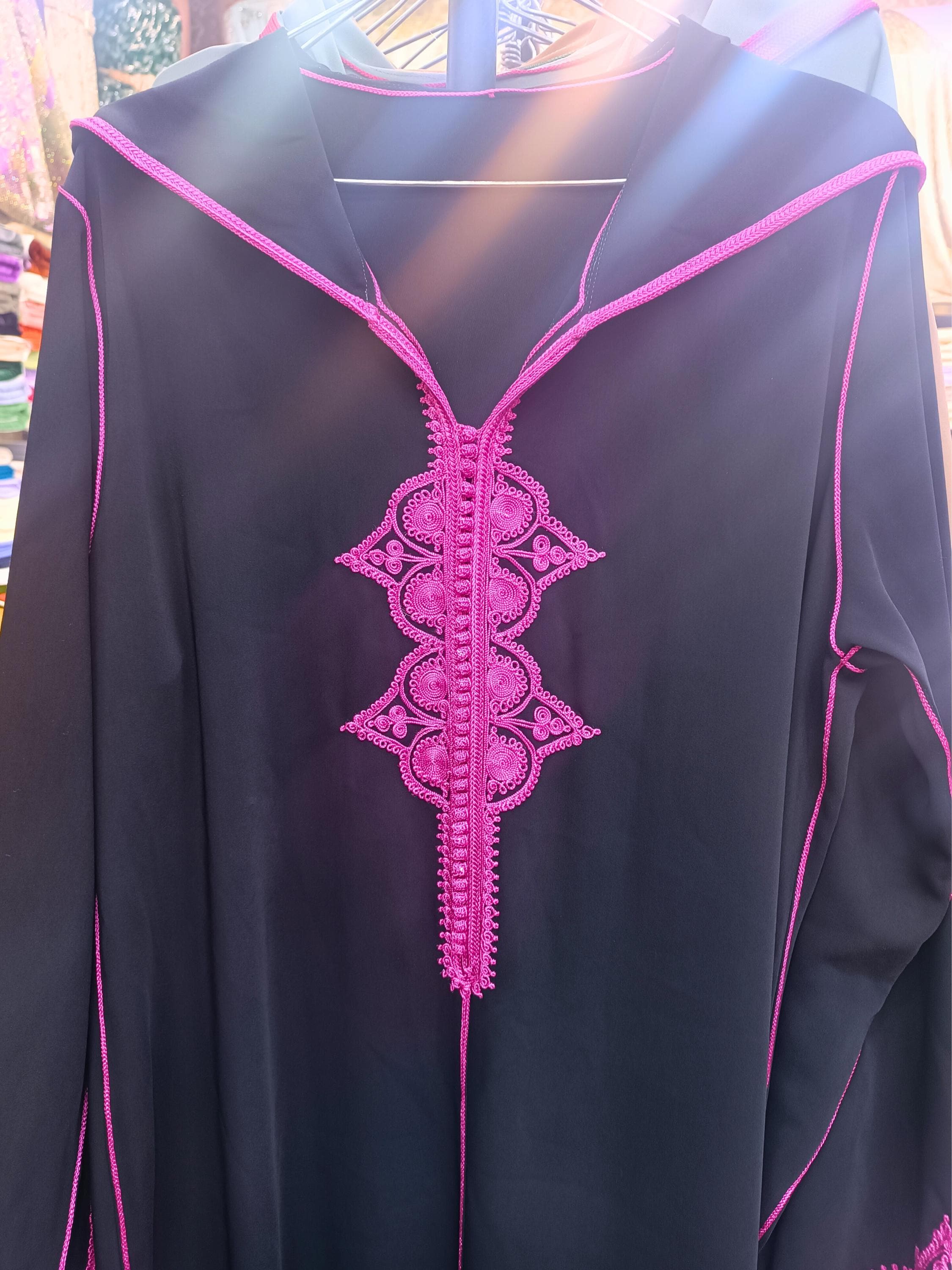 Chic Moroccan djellaba, black elegance with pink accents, Handcrafted.