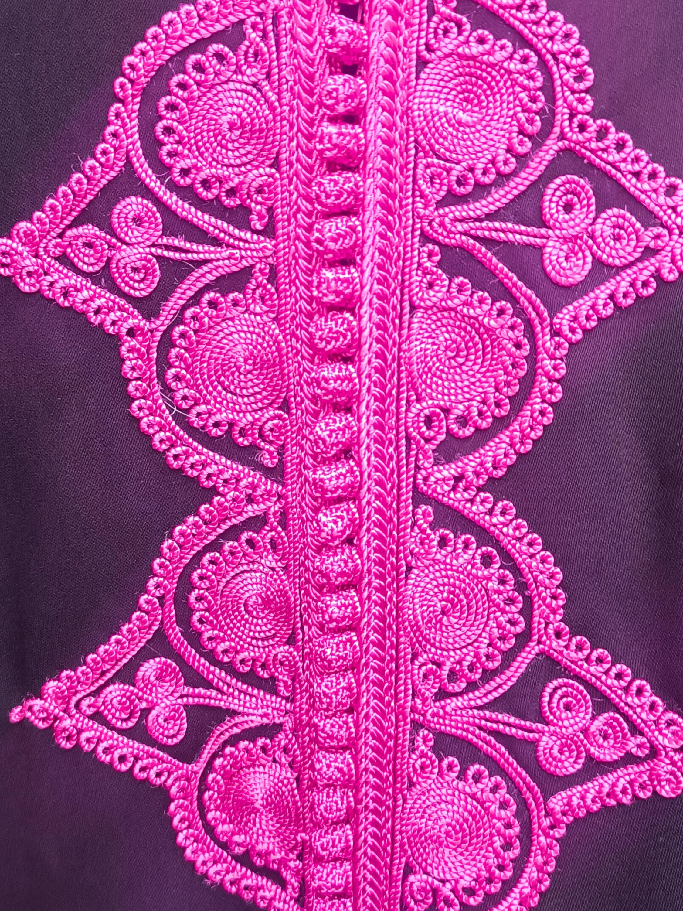 Shine in unmatched elegance with this handmade black Moroccan djellaba, adorned with deep pink embroidery for an artistic and luxurious touch.