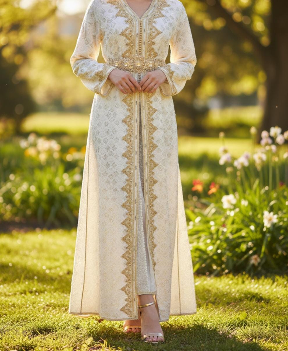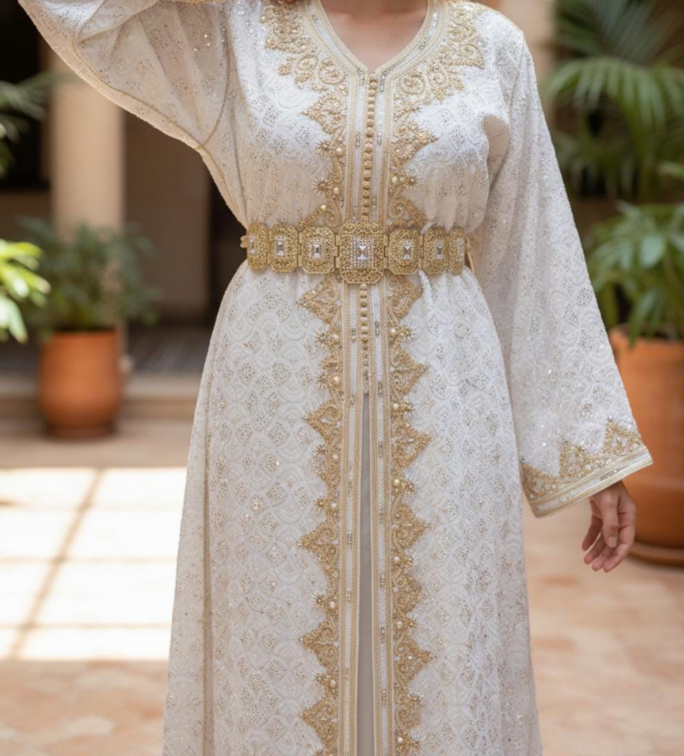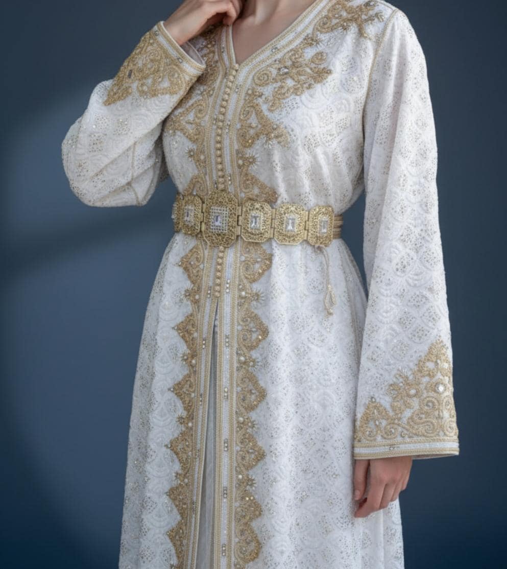 Elegant Moroccan kaftan crafted with traditional design, perfect for weddings and special occasions. Timeless style with refined details.