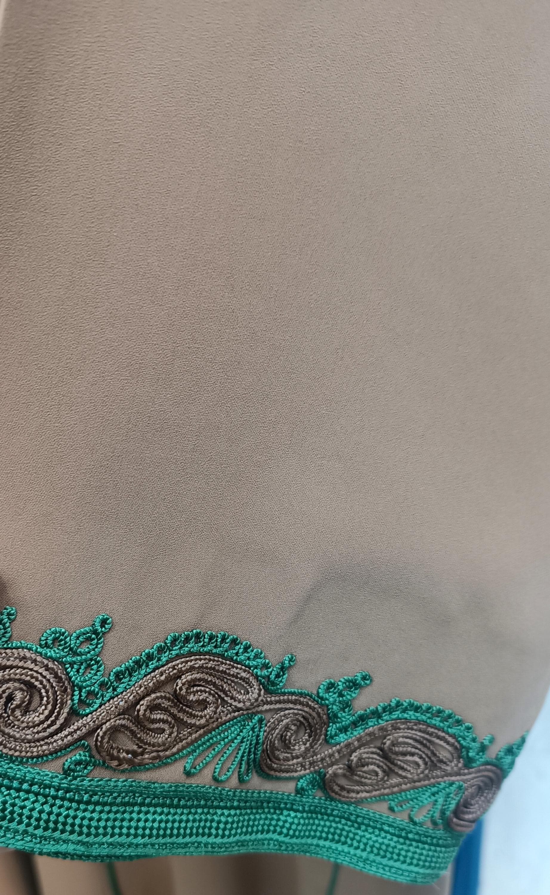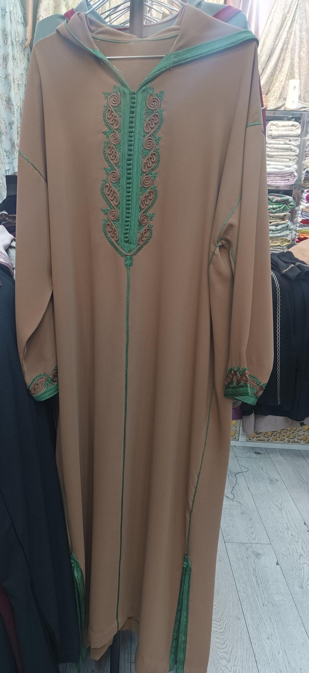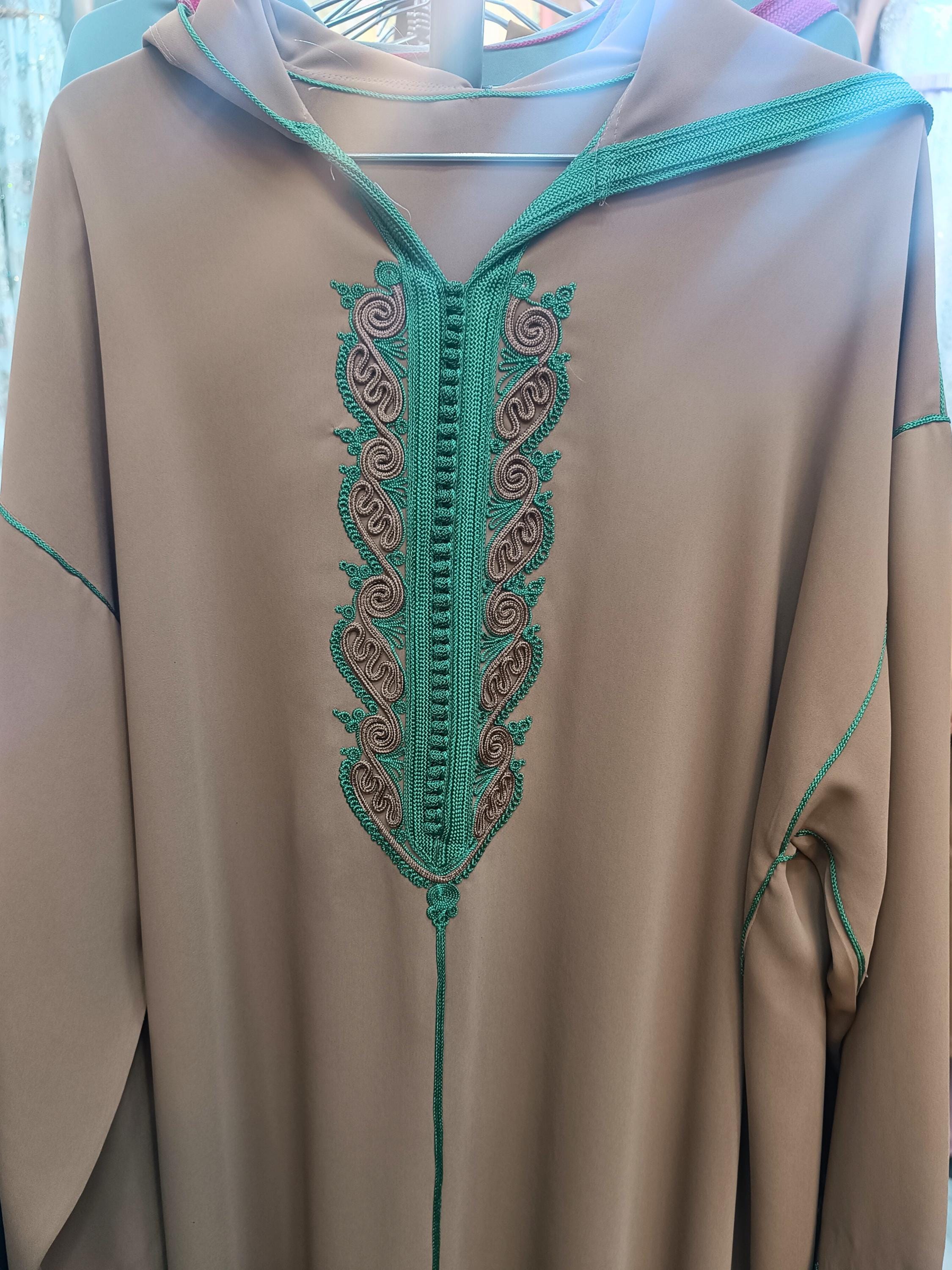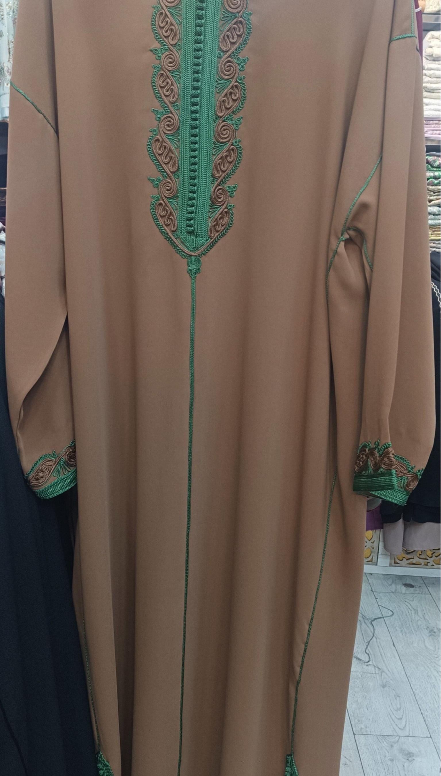 Luxury handmade caramel Moroccan djellaba, elegant green embroidery.