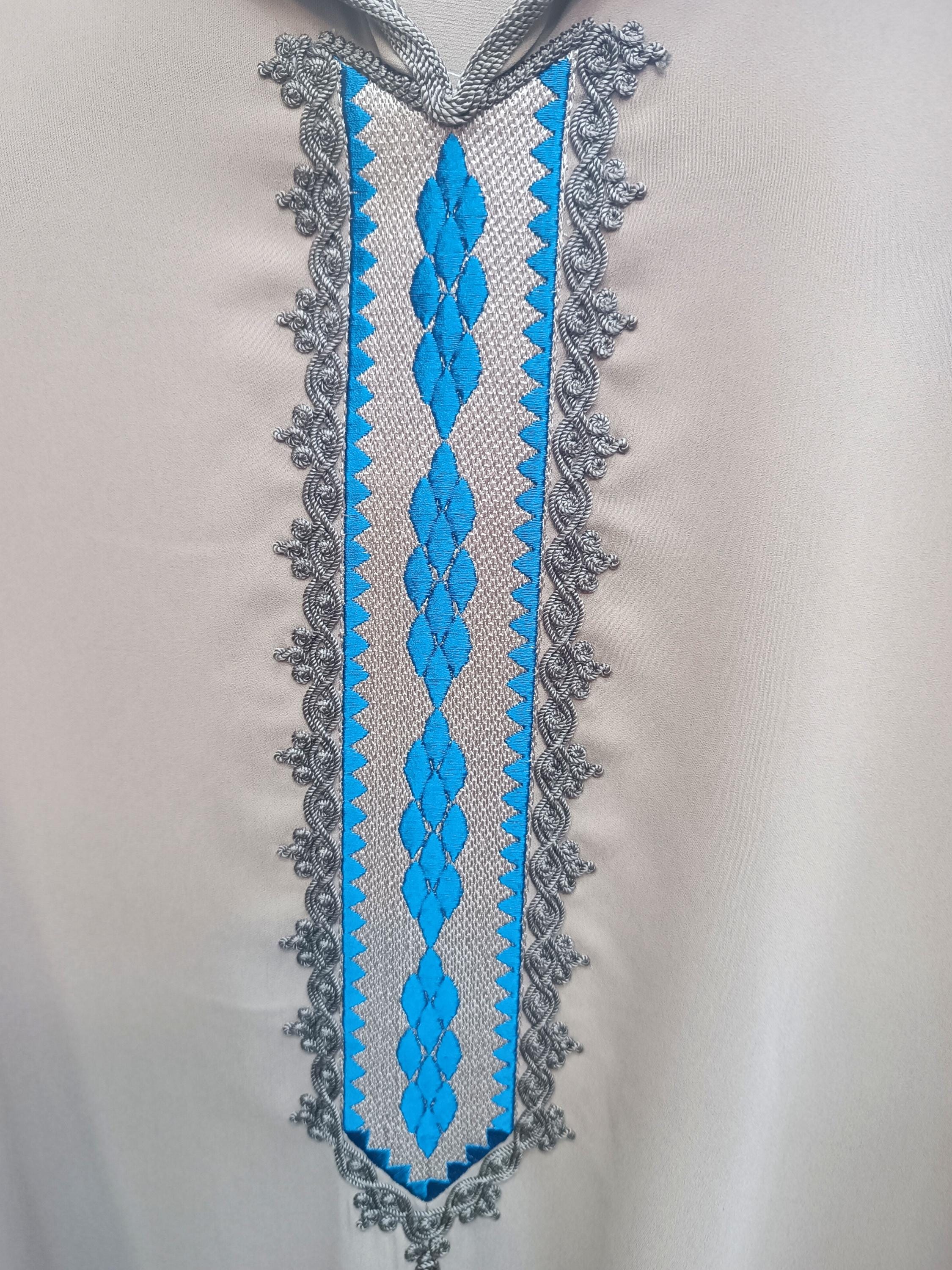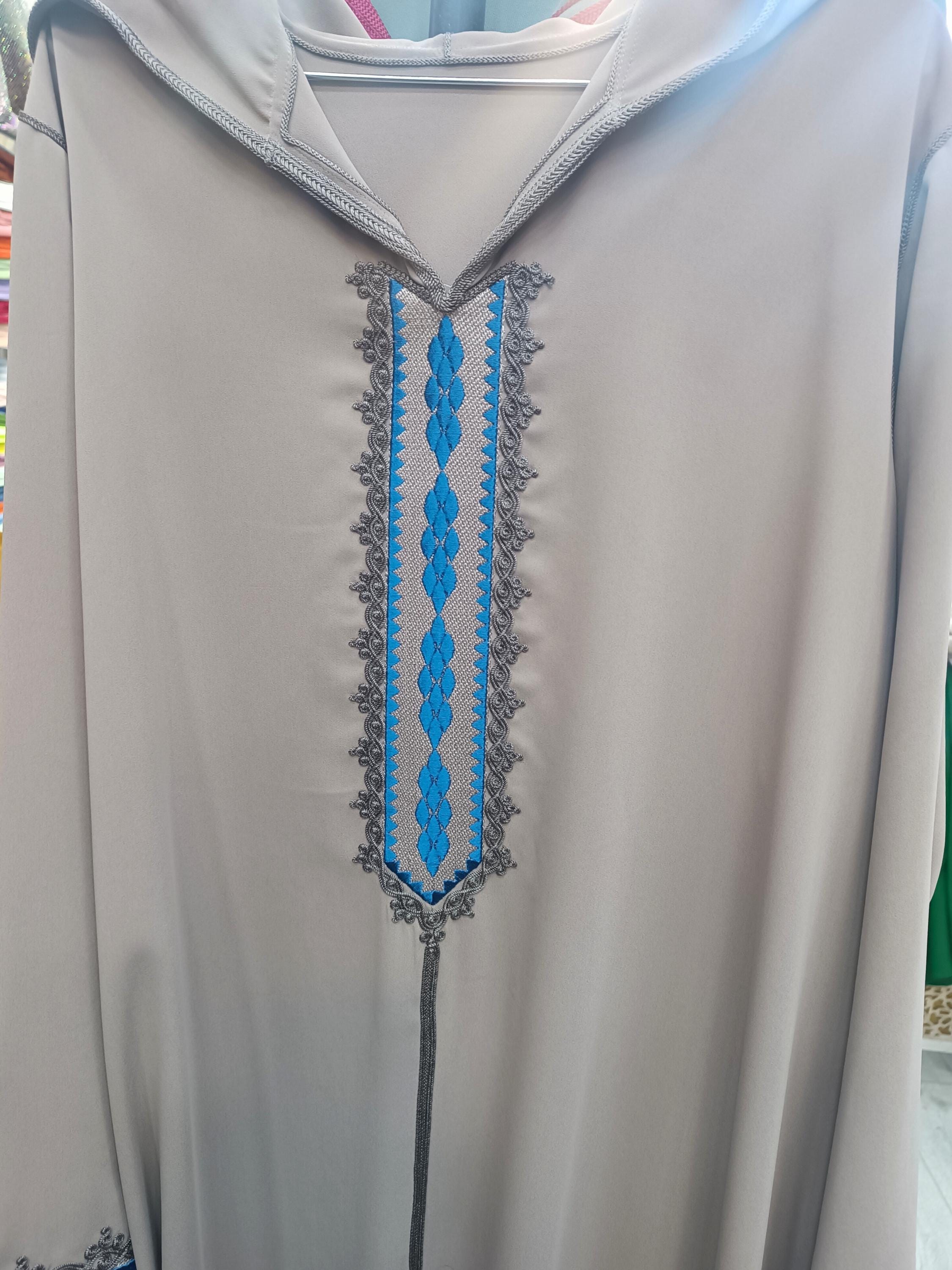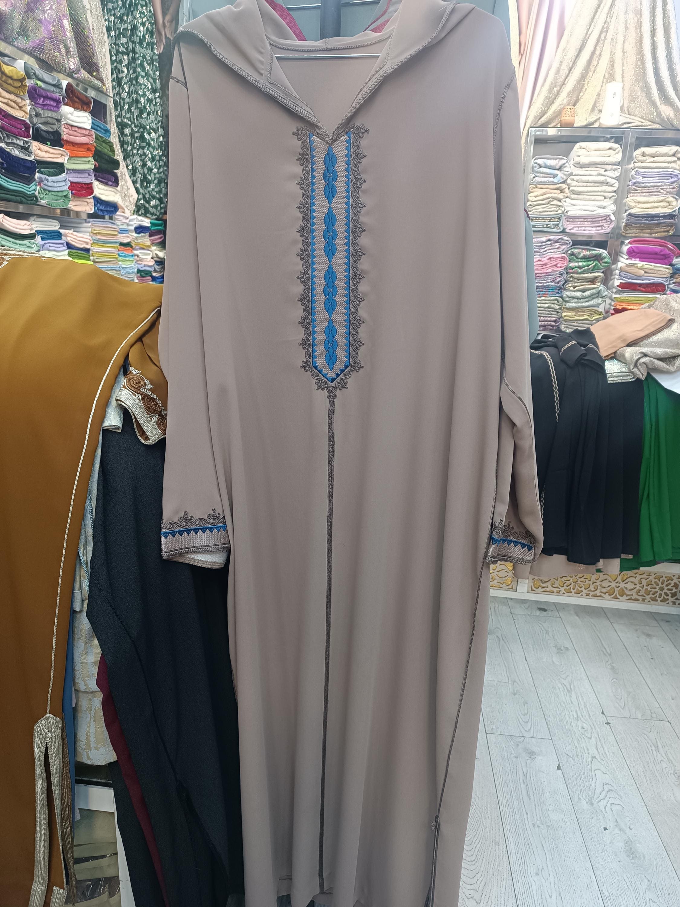 A luxurious Moroccan djellaba in a refined earth tone, beautifully enhanced with delicate blue embroidery. Designed for elegance and comfort, it's perfect for special occasions as well as elevated everyday wear. A timeless piece that blends tradition with modern sophistication.