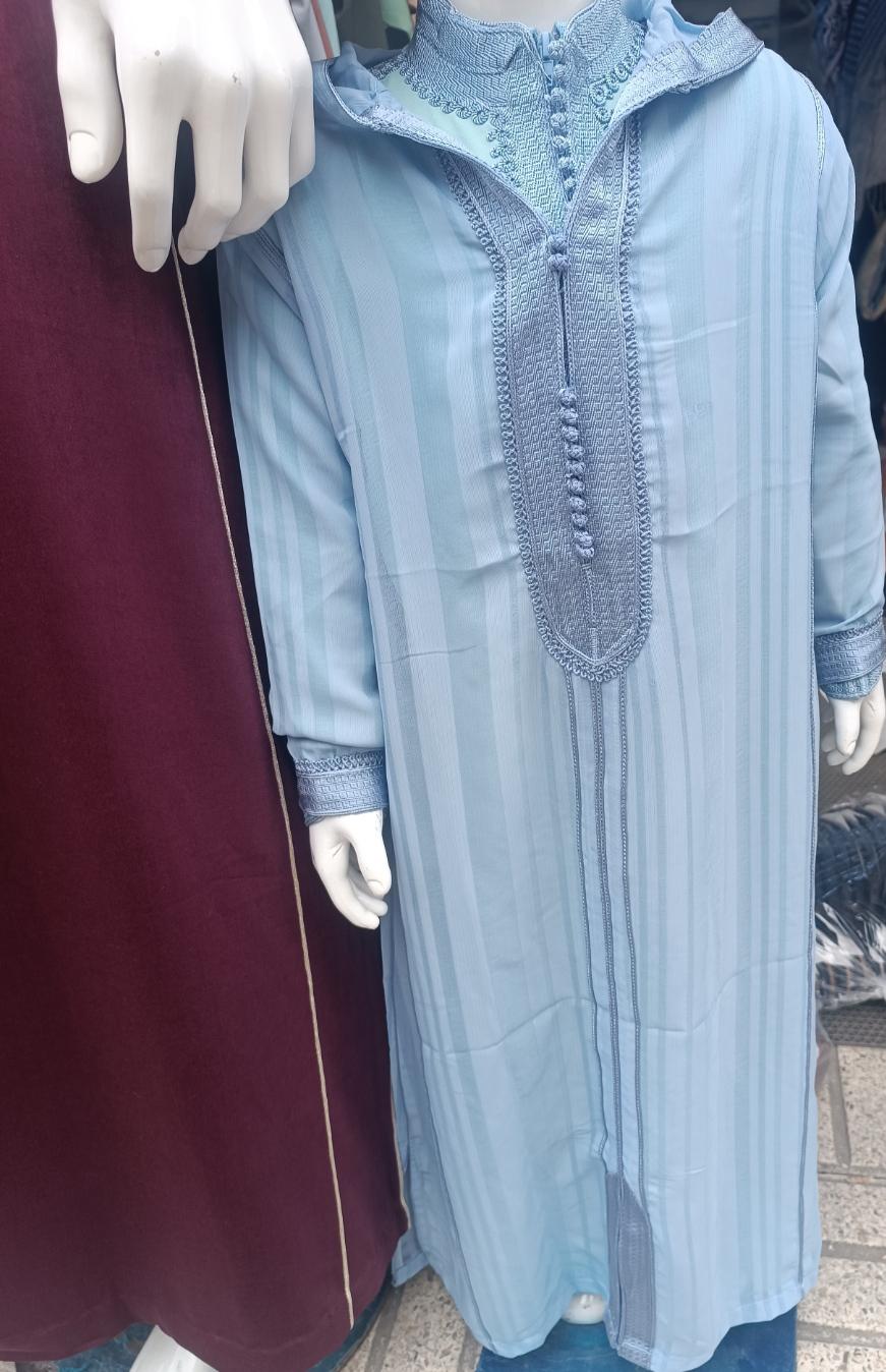 Light blue Moroccan boys djellaba set,a charming traditional outfit crafted for little gentleman.This elegant 2 piece set features a soft light blue djellaba with a matching shirt, perfect for eid,special occasions,and stylish everyday wear.comfortable,authentic,and beautifully tailored for your little prince.
