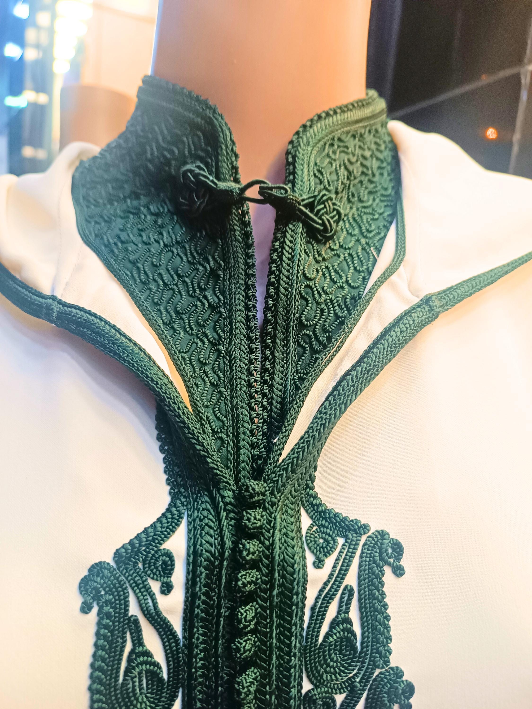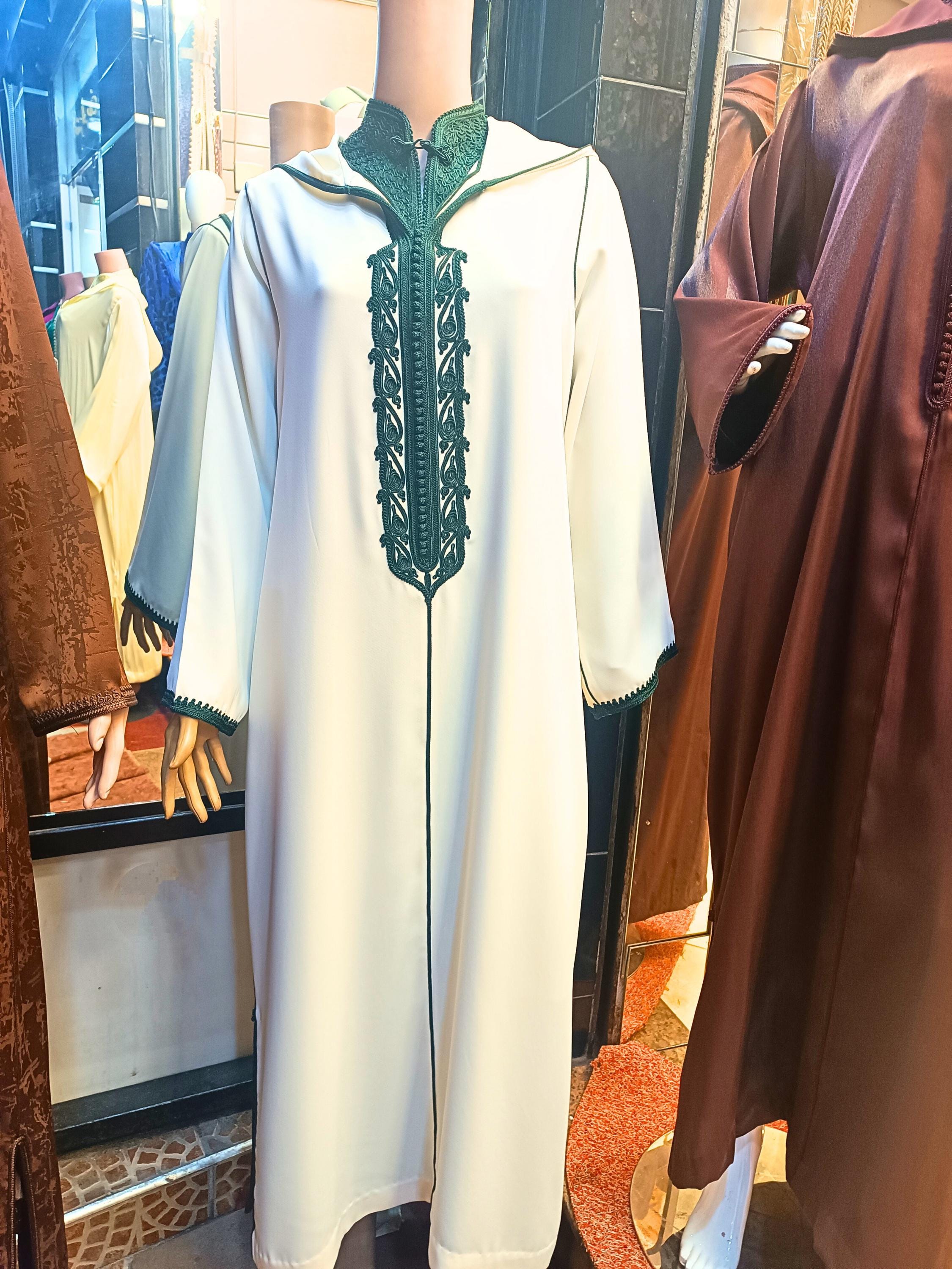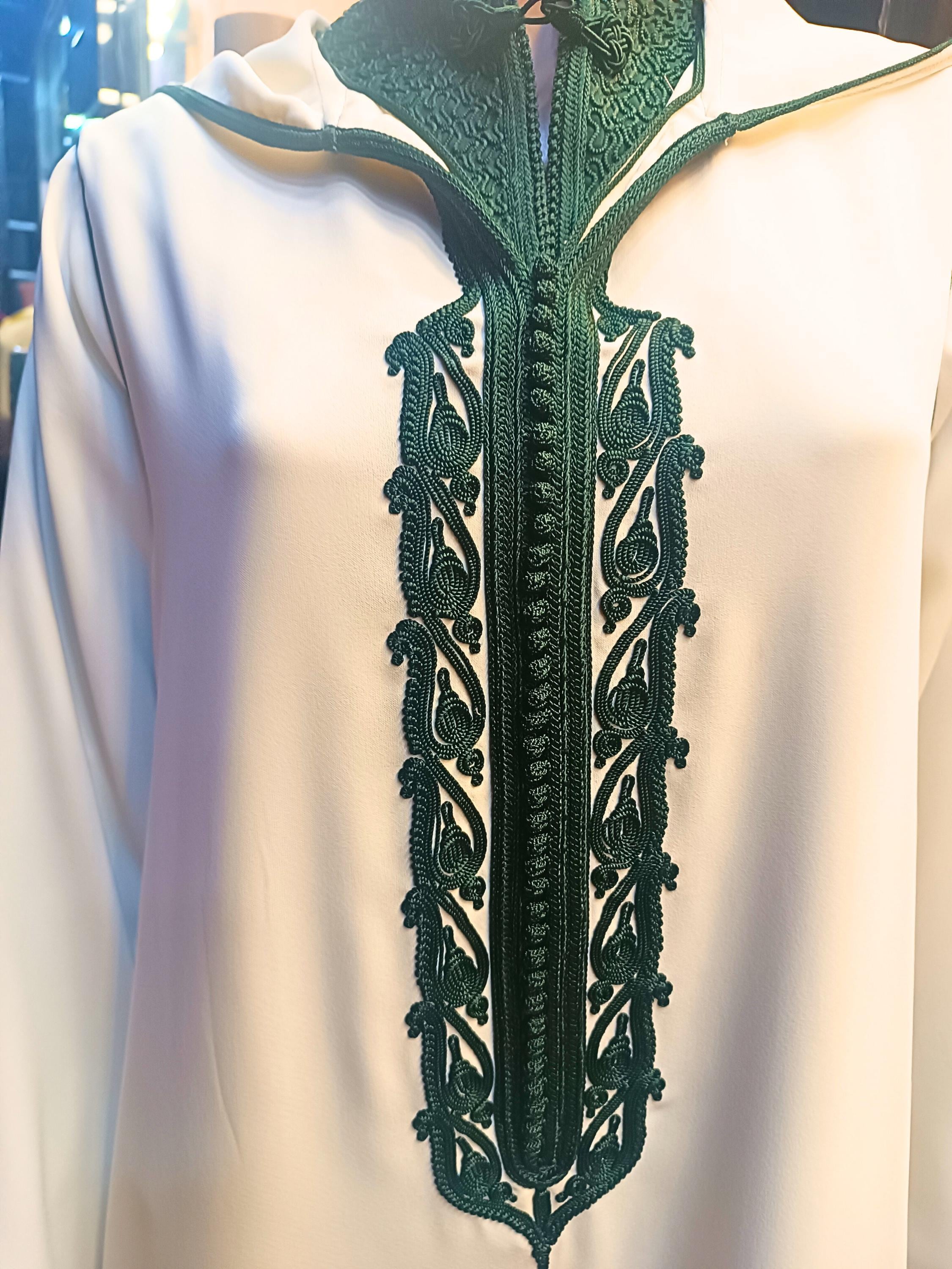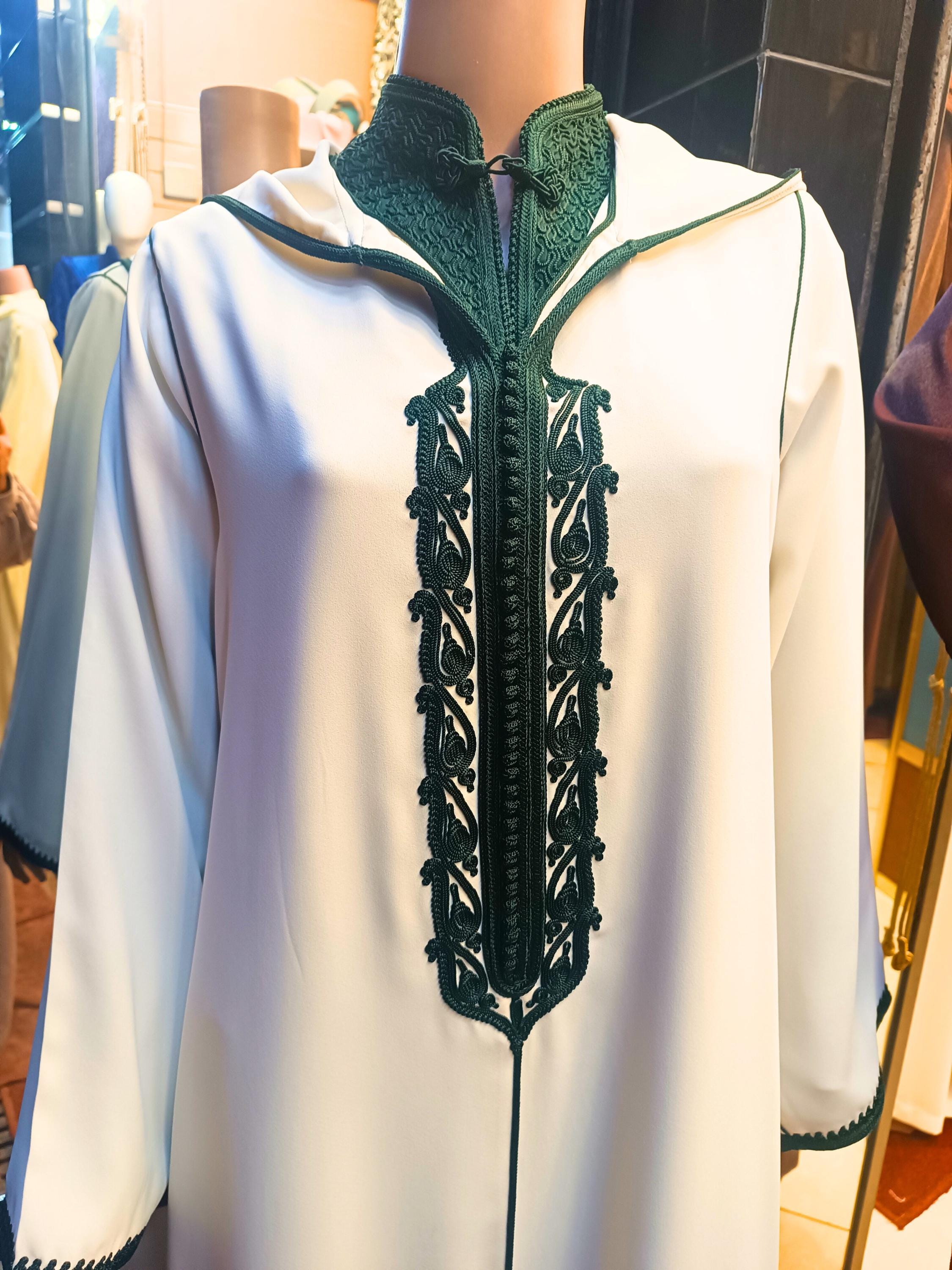 Elegant Moroccan 2 piece djellaba set featuring a refined white djellaba beautifully embroidered in green and a matching green dress underneath.Wear them together for a sophisticated look or separately for versatile everyday elegance.Perfect for special occasions,eid,or stylish daily wear.