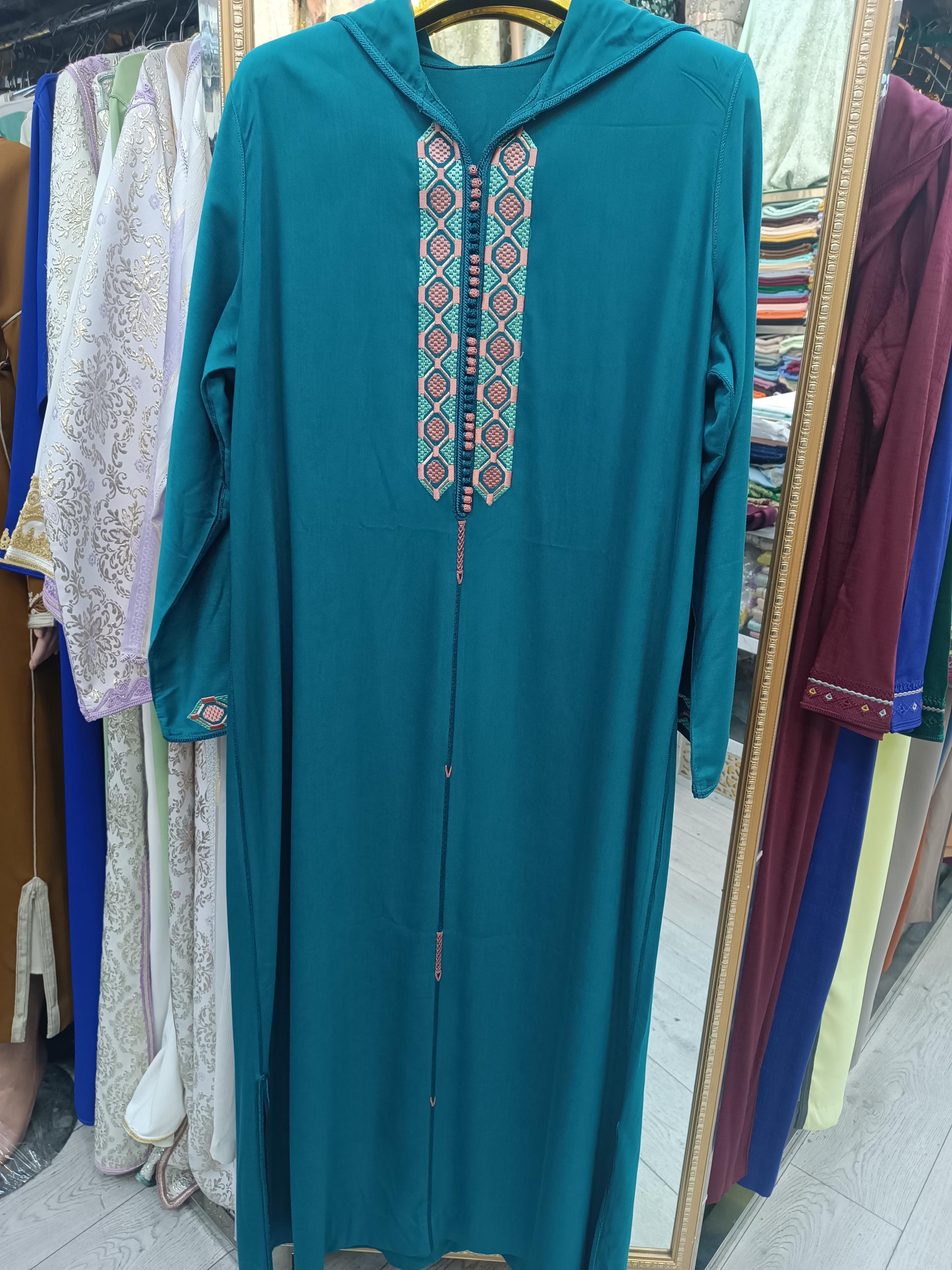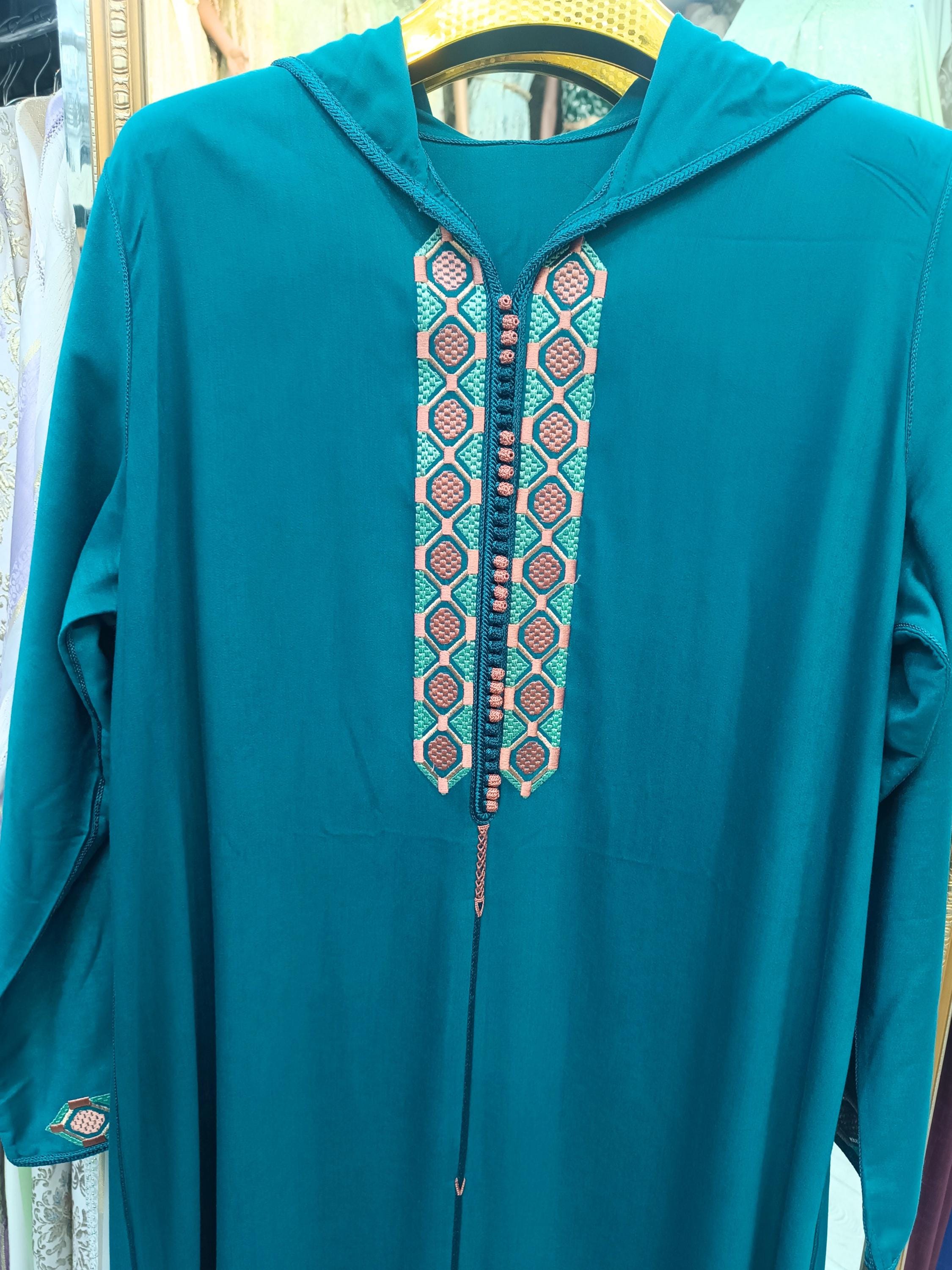 A stunning patina blue Moroccan djellaba for women, adorned with delicate light green and orange embroidery, reflecting exquisite craftsmanship and vibrant elegance for a unique traditional look.