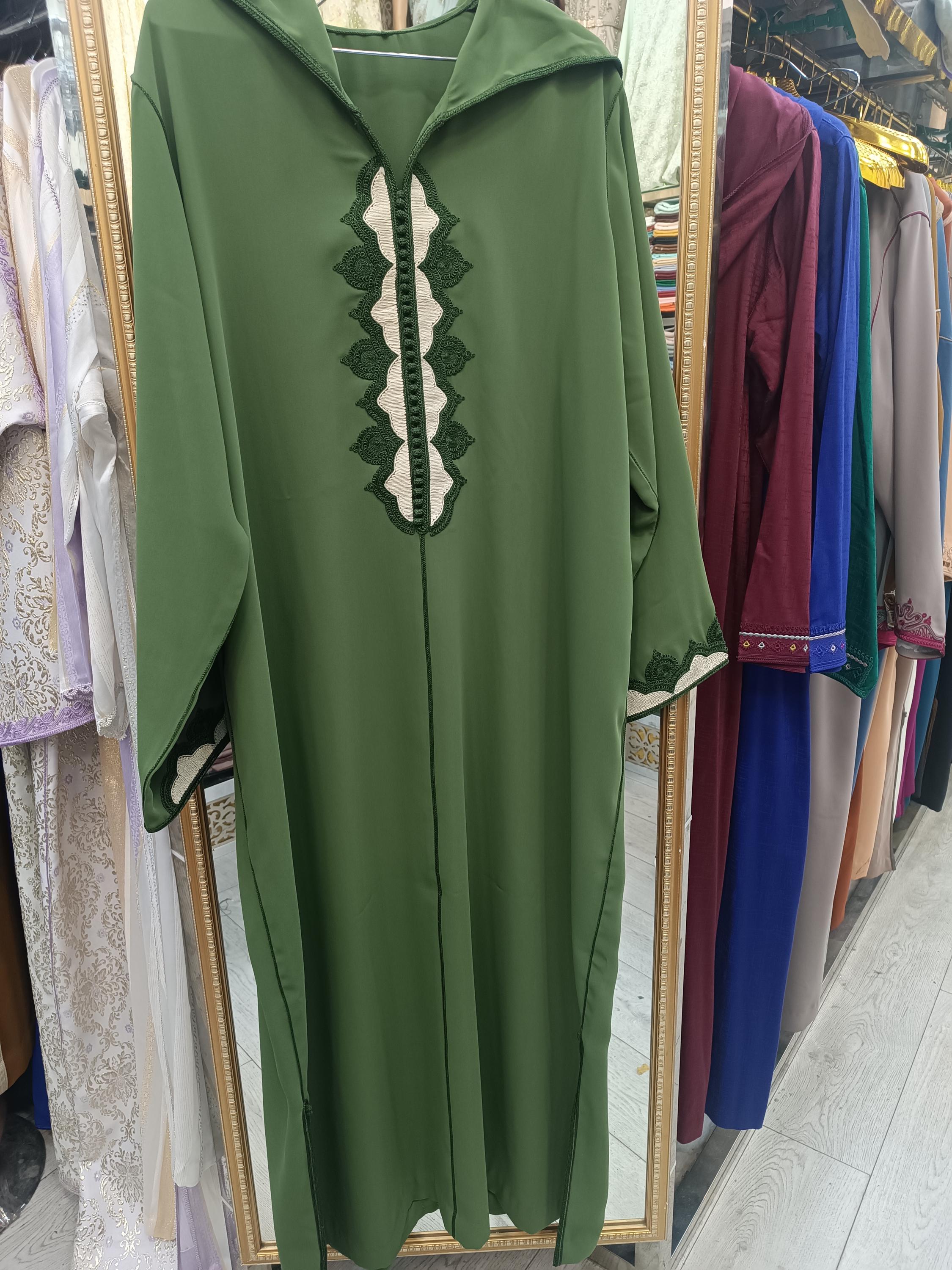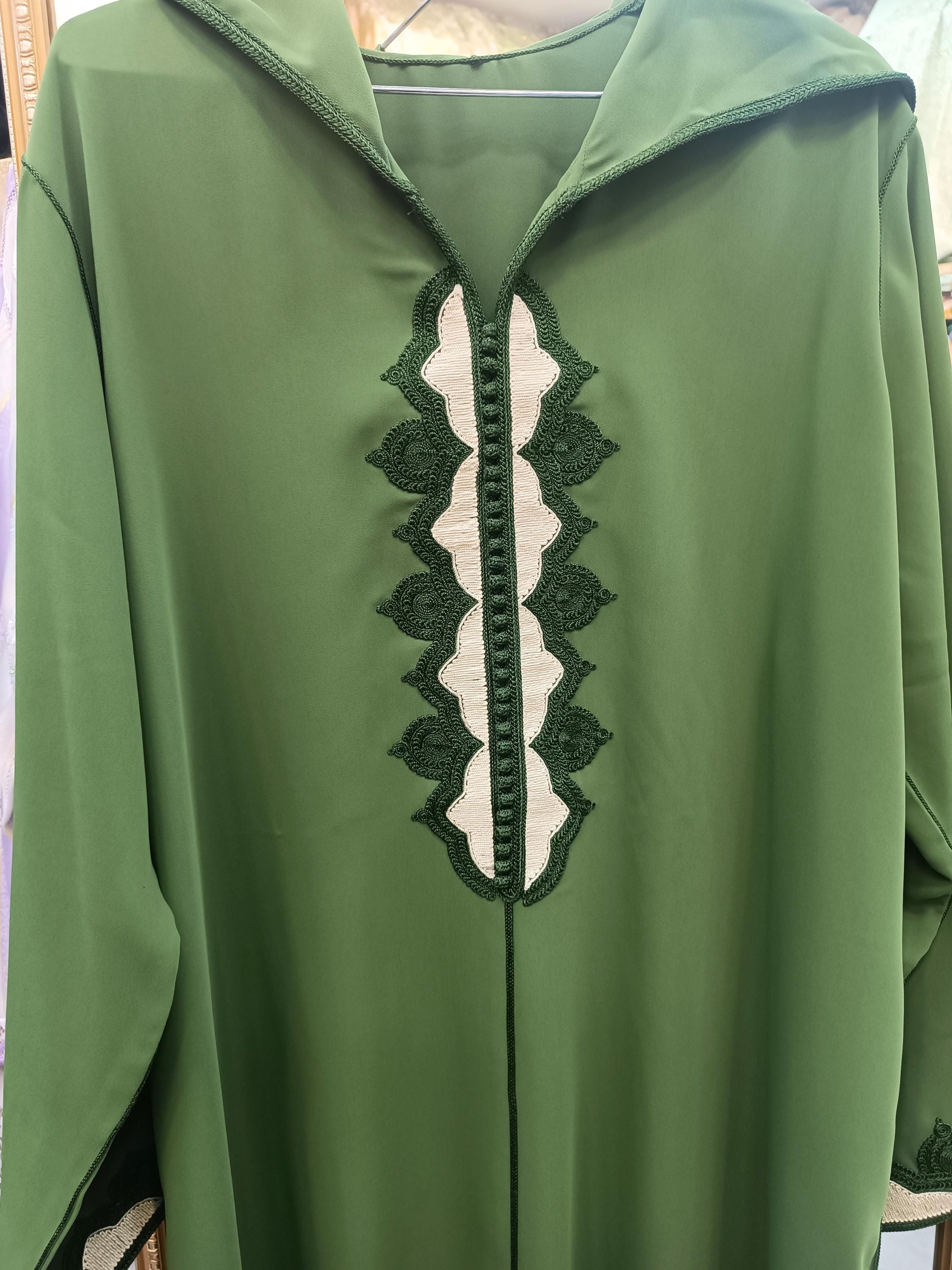 A stunning olive green Moroccan djellaba for women, crafted with exquisite attention to detail, offering lightweight elegance and refined comfort, ideal for a sophisticated look in spring and summer.